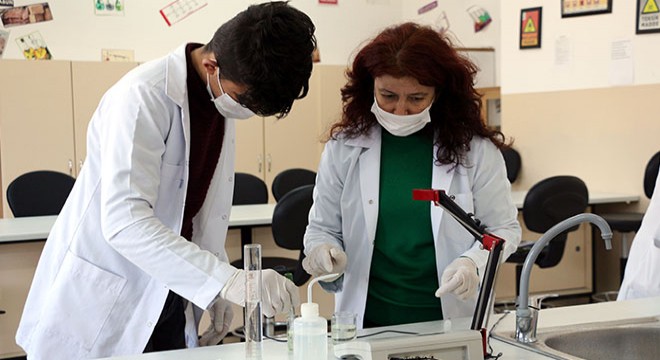 Kimya teknolojisi öğretmeni Emel Moral, "PH ölçümünü burada yapıyoruz. Çünkü yüzeye dezenfektanın etkili olabilmesi için PH önemlidir. Öğrencilerimiz zaten o yeterliliğe sahip. Burada hep birlikte ölçümü yaptıktan sonra içeride üretime geçiliyor" diye konuştu.