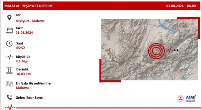 Afet ve Acil Durum Yönetimi Başkanlığı (AFAD) verilerine göre saat 05.52’de merkez üssü Malatya’nın Yeşilyurt ilçesinde Riçhter ölçeğine göre 4.4 büyüklüğünde deprem kaydedildi. Zeminden 10.38 kilometre derinlikte meydana gelen deprem, Malatya kent merkezi ve ilçelerinden de hissedildi. AFAD ve belediye ekipleri depremden sonra saha taraması başlatırken, ilk belirlemelere göre herhangi bir olumsuzluk yaşanmadı.