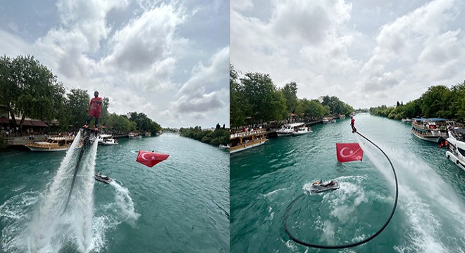 19 Mayıs Gençlik ve Spor Bayramı törenleri kapsamında Side SAK Derneği üyeleri Manavgat Irmağı'nda Türk bayrağı açarak su gösterisi gerçekleştirdi.