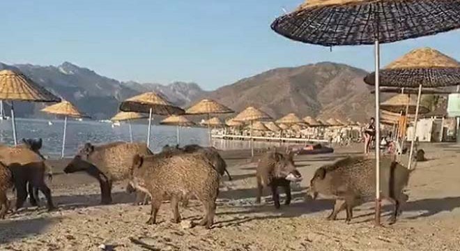 Domuz sürüsü, Marmaris'te halk plajına indi. Plajda şezlonglar arasında gezinen domuzları gören yerli-yabancı turistler, o anları cep telefonu kamerası ile kaydetti. Uzun süre plajdaki şezlongların arasında yiyecek arayan sürü, daha sonra ormana döndü. Marmaris'te ormana yakın yerleşim yerlerine beslenme amaçlı inen yaban domuzlarının, vatandaşlar tarafından yiyecek verilmesi nedeniyle evcilleşmeye başladıkları belirtildi.