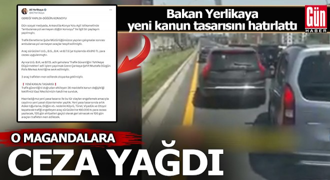Bakan Yerlikaya, sosyal medya hesabından yaptığı açıklamada, dün sosyal medyada, Ankara'da 'ambulansa yol vermeyen düğün konvoyu' ile ilgili bir paylaşım yapıldığını ifade etti. Trafik Denetleme Şube Müdürlüğü tarafından yapılan çalışmalar sonrası ambulansa yol vermeyen araçların tespit edildiğini belirten Yerlikaya, "Araç sürücüleri U.G., B.S., B.K. ve B.T.S.'ye toplamda 49 bin 810 TL para cezası uygulanmıştır. Ayrıca U.G., B.K. ve B.T.S. adlı şahıslara 'Trafik Güvenliğini Tehlikeye Düşürmekten' adli işlem yapılmak üzere Çankaya Şehit Mustafa Düzgün Polis Merkez Amirliğine sevk edilmiştir. 3 araç trafikten menedilerek otoparka çekilmiştir" dedi.