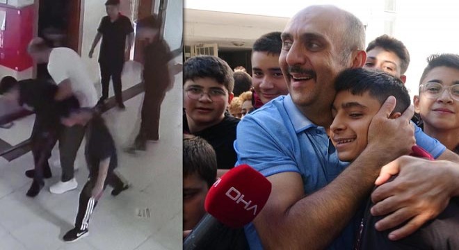 Okul bahçesinde öğretmenleri Cem Bilal Kaya'yı alkışlar eşliğinde omuzlarına alan öğrenciler, "Cem Hocam” diyerek sloganlar atarken, meslektaşları da pencereden alkışladı.