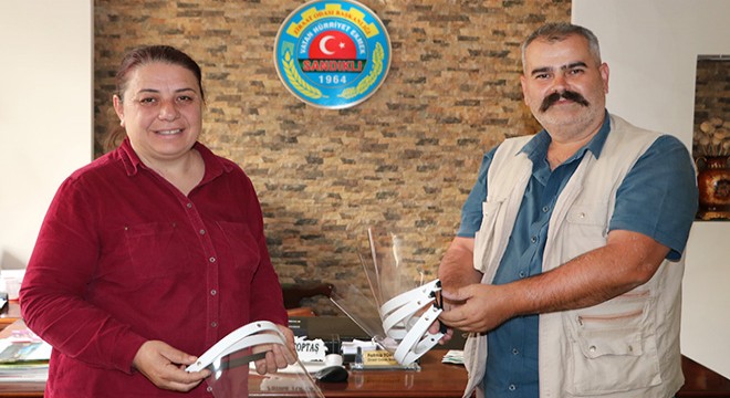 Sandıklı'da görev yapan teknoloji tasarım öğretmeni Ali Eren, Ziraat Odası Başkanı Fatma Toptaş'ı ziyaret etti. Ali Eren kendi ürettiği yüz koruyucu siperlikli maskeleri oda personelinin kullanması amacıyla Başkan Toptaş'a hediye etti. Ali Eren, "Tarımın ve üretimin şu koronavirüs günlerinde ne kadar önem arz ettiğinin farkındayız. Üreticiler için çalışan Ziraat Odası'na biz de kendi imkanlarımız ölçüsünde katkı sağlamak amaçlı böyle bir çalışma yaptık" dedi.