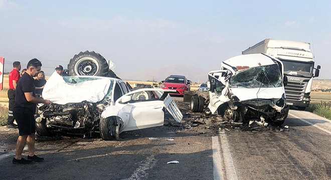Kaza, saat 09.00 sıralarında, Çay ilçesi Devederesi mevkisinde meydana geldi. Çay'dan Dinar yönüne giden R.T. (63), iddiaya göre, yönetimindeki 09 AHH 890 plakalı otomobil ile önünde giden B.İ.E. yönetimindeki M7-08EB-193 yabancı plakalı aracı solladı. Bu sırada R.T.'nin otomobili, karşı yönden gelen B.C.'nin (28) kullandığı 38 VD 313 plakalı ve traktör yüklü kamyonetle kafa kafaya çarpıştı. Çarpışmanın şiddetiyle savrulan araçlar, devrildi. Yabancı plakalı otomobil ise şarampole yuvarlandı. İhbarla kaza yerine sağlık ve jandarma ekipleri sevk edildi. Sağlık görevlileri, otomobilde bulunan C.T.'nin (55) yaşamını yitirdiğini belirledi. Yaralanan otomobil sürücüsü R.T. ile kamyonet sürücüsü B.C. de sağlık ekiplerinin ilk müdahalesinin ardından Çay Devlet Hastanesi'ne götürüldü. R.T. de hastanede kurtarılamadı. Kazayla ilgili soruşturma başlatıldı.