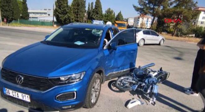 Kaza saat 09.30 sıralarında Bülent Ecevit Bulvarı Süt Fabrikası Kavşağında meydana geldi. Emine İzgi A. yönetimindeki 06 CTA 911 plakalı otomobille Abdullah A. idaresindeki 15 AAC 294 plakalı motosiklet çarpıştı. İhbar üzerine olay yerine sağlık ve polis ekipleri sevk edildi.Kazada motosiklet sürücü Abdulah A. ile beraberindeki Burak S. yaralandı. Yaralılar Burdur Devlet Hastanesi'ne götürüldü. Yaralıların durumunun iyi olduğu öğrenildi. Otomobil sürücüsü de ifadesi alınmak üzere polis merkezine götürüldü. (DHA)