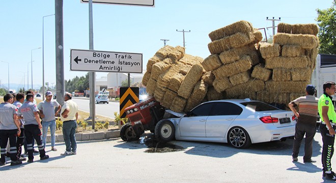 Kaza, saat 15:00 sıralarında Antalya- Burdur karayolunun Bucak Organize Sanayi Bölgesi kavşağında meydana geldi. Burdur'dan Antalya yönüne giden F.A.Ö. idaresindeki 07 BHH 481 plakalı otomobil ile A.Ç. idaresindeki 32 FU 248 plakalı saman balyası yüklü traktör çarpıştı. Kazayı görenlerin ihbarı üzerine bölgeye polis, sağlık ve itfaiye ekipleri sevk edildi. Sağlık ekipleri otomobilde yaralanan S.Ö. ve M.İ.'yi kaza yerinde yapılan ilk müdahaleden sonra Bucak Devlet Hastanesi'ne götürdü. Yaralıların sağlık durumlarının iyi olduğu belirtildi.