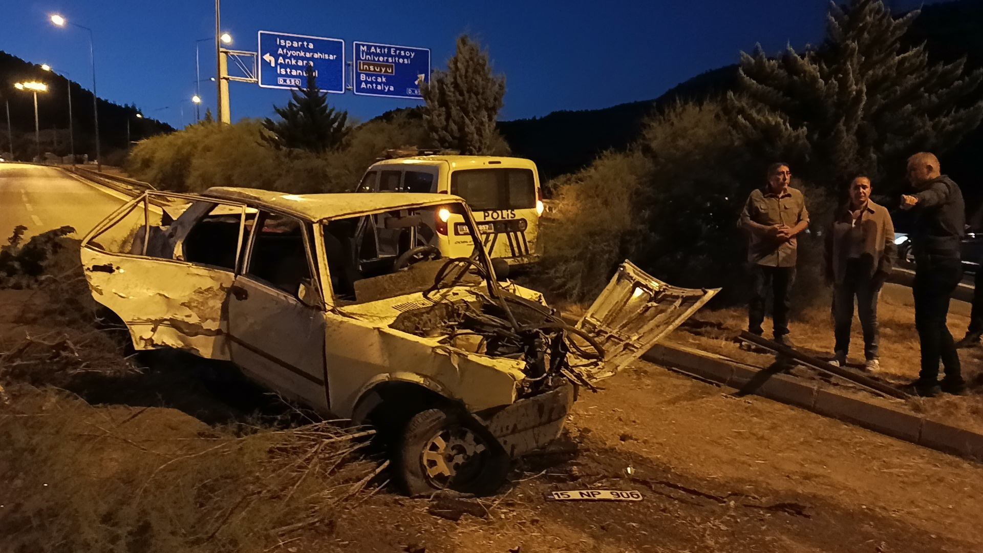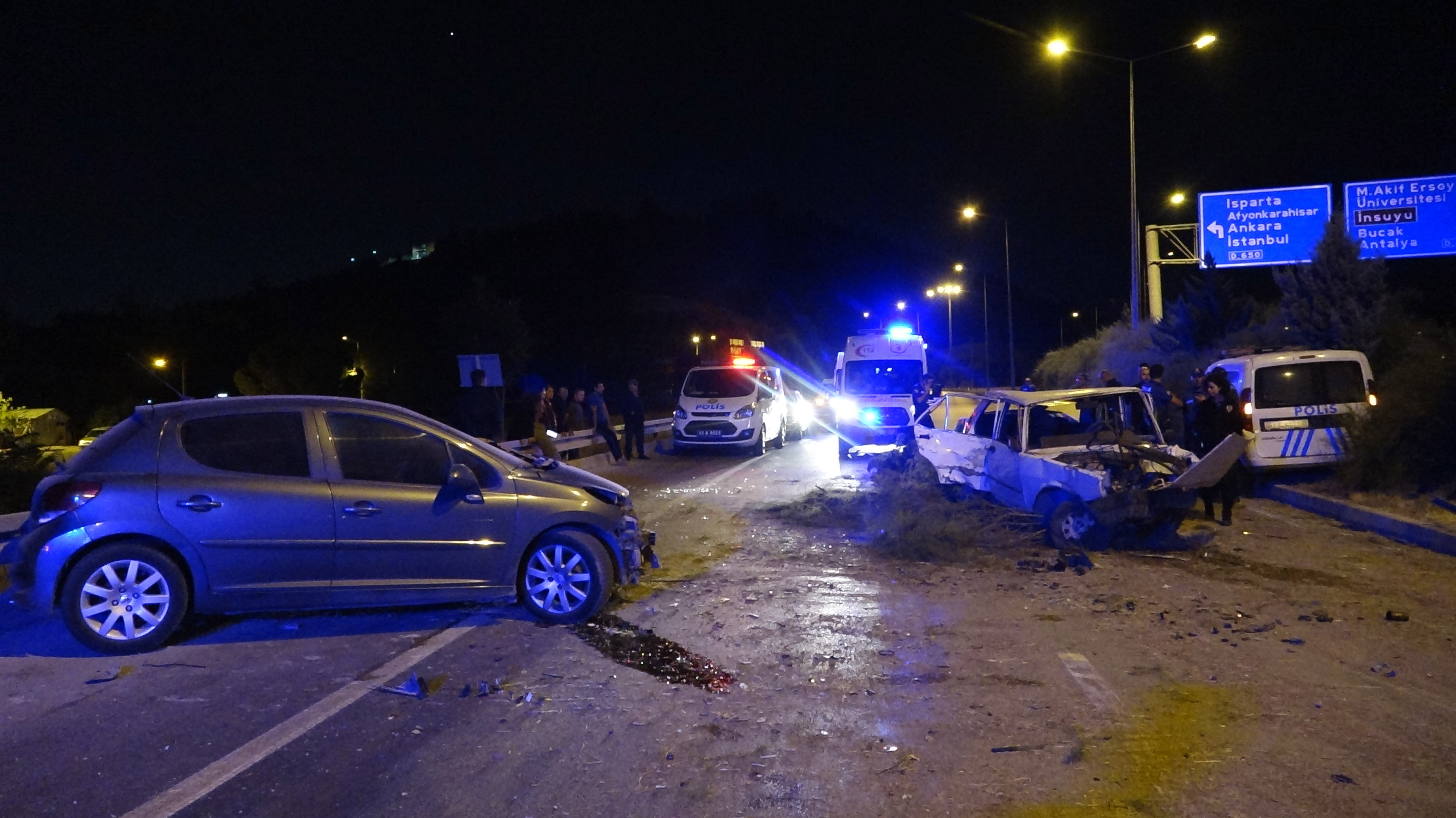 Burdur kent merkezinde, saat 05.00 sıralarında, yüksek sesle müzik dinleyip çevreyi rahatsız ettikleri ihbar edilen 15 NP 906 plakalı otomobildekiler, polis tarafından takibe alındı. Otomobilin sürücüsü M.Y. (26), polisin 'dur' ihtarına uymayıp Burdur-Antalya yolunda ilerledi. M.Y., Karasenir Mahallesi'ne kadar geldiği otomobiliyle, kendisini takip eden Asayiş Şube Müdürlüğü ekibinin aracına çarptıktan sonra refüjü aşıp, bu kez karşı şeritten gelen B.K. (37) yönetimindeki 46 ABS 138 plakalı otomobile çarptı. Araçların hurdaya döndüğü kazanın ihbarıyla bölgeye çok sayıda sağlık ve polis ekibi sevk edildi. Kazada, sürücüler ile araçlarda bulunan M.Y. (31), İ.G. (30), A.K. (34), İ.E.K. (13) ve A.C.K. (11) ile ekip aracındaki komiser ve 2 polis memuru yaralandı. İlk müdahalesi bölgede yapılan yaralılar, ambulanslarla Burdur Devlet Hastanesi'ne götürülüp tedaviye alındı. Yaralıların durumunun iyi olduğu belirtildi.