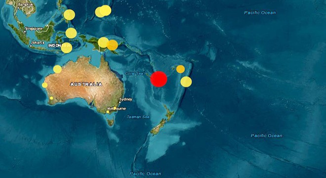 Avustralya devletinin jeoloji kurumu Geoscience Australia, ülkenin doğusunda bulunan Yeni Kaledonya’nın yakınlarında, okyanusun 33 kilometre derinliğinde 7.7 büyüklüğünde deprem meydana geldiğini duyurdu. Avustralya Tsunami Merkezi, bölgedeki ülkeler ve yerleşim yerleri için tsunami uyarısı yaparken Avustralya Meteoroloji Bürosu Yeni Kaledonya’da 22 cm ve Yeni Zelanda’da 33 cm’lik dalgalar görüldüğünü belirtti. Yetkililer, Avustralya’nın tsunami tehlikesi altında olmadığını kaydetti.