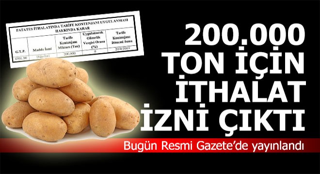Resmi Gazete'nin bugünkü sayısında yer alan Cumhurbaşkanı kararına göre, sıfır gümrük vergili patates ithalatı 20 Nisan'a kadar yapılabilecek.