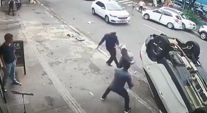 Olay, Brezilya’nın Sao Paulo kentindeki Pinheiros bölgesinde meydana geldi. Bir evi soyan hırsızlar bir cip ile olay yerinden kaçtı. Hırsızları takibe alan polisler, aracı trafiğin yoğun olduğu bir noktada durdurmak istedi ancak hırsızlar aracı ileri geri hareket ettirerek kendilerine kaçmak için yol açtı. Birçok araca ve polis motosikletine çarpan hırsızlar, ardından yolun sağındaki boşluktan yararlanarak bölgeden kaçtı. Motosikletli polislerin peşine takıldığı hırsızlar, bir süre ilerledikten sonra bir başka araçla çarpıştı ve takla atarak sürüklendi. Hırsızlar, ters dönen aracın kapı ve bagajından çıkarak kaçmaya çalıştı ancak bölgedeki esnaf tarafından yakalandı. Bagajdan kaçan hırsızın bir esnaf tarafından çelme takılarak düşürüldüğü ve yakalandığı an ve kaza anları bir işyeri güvenlik kamerasınca anbean kaydedildi.