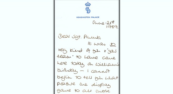 "Sevgili Çavuş Plumb, bugün William'ın doğum gününde buraya gelmek senin ve ekibin için çok nazik bir davranıştı. Şu anda hepinizin ne kadar meşgul olduğunu biliyorum, bu yüzden sizin ve motosiklet ekibinizin doğum günü kutlamalarına katılabilmeniz bizim için çok önemliydi! En içten teşekkürlerimizi iletiyoruz. Saygılarımla Diana, William, Harry."