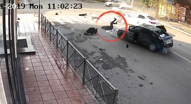 Rusya Federasyonu’nun Dağıstan Özerk Cumhuriyetindeki Mohaçkale kentinde meydana gelen kazada, kavşakta hız yapan otomobil, yolun solundan gelen bir otomobilin çarptı. Kontrolden çıkan otomobil karşı şeritten gelen başka bir otomobile çarptı. Çarpışmanın etkisiyle, otomobilin kapıları açılınca yolcu ve sürücü yola savruldu. Yerel medya, 40 yaşındaki sürücünü ve 37 yaşındaki eşinin şans eseri kazadan yaralı kurtulduklarını duyurdu.