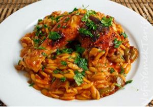 Isınmış tavada tavuklarımızı hafif kızartıyoruz diğer tavada yağı ısıtıyoruz, soğanı kavuruyoruz ve biberi ekleyip soteliyoruz. (yaklaşık 5-7 dk yumuşayana kadar) Arpa şehriyeyi ilave ediyoruz, 5 dk karıştırıyoruz, sonra domates püresi ve tuz, karabiberi ekleyip ateşten alıyoruz. Malzemeyi fırın tepsisine boşaltıyoruz ve tavuk suyunu ekliyoruz, en üstüne de tavukları diziyoruz, ısınmış fırında yaklaşık 30/45dk. pişiriyoruz.