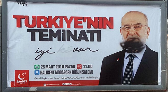 SP Genel Başkanı Karamollaoğlu'nun 25 Mart Pazar günü katılacağı, Halıkent Mahallesi'ndeki düğün salonunda yapılacak program için geçen hafta kentteki billboardlara duyuru afişleri asıldı. 113'üncü Cadde ve Yeni Sanayi Sitesi'nde asılı 10'dan fazla afiş, önceki gece, kimliği belirsiz kişi ya da kişilerce boyandı. Karamollaoğlu'nun afişteki fotoğrafının çene kısmı siyah sprey boyayla boyanırken, parti logosu ve bazı afişlerin üzerine de çarpı işaretleri konuldu.