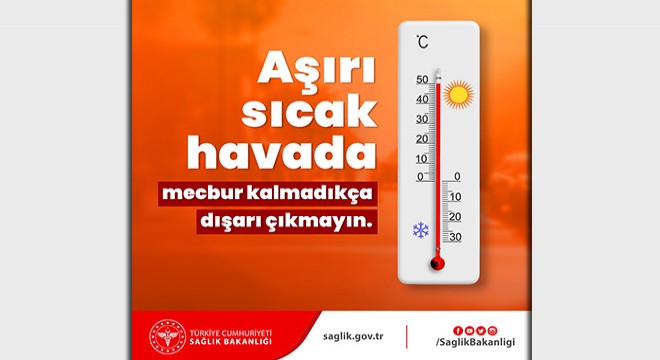 Bakanlığın Twitter hesabından hava sıcaklığının 50 dereceye ulaştığını gösteren 'Aşırı sıcak havada mecbur kalmadıkça dışarı çıkmayın' mesajı yazılı termometre fotoğrafı paylaşıldı. Açıklamada, "Aşırı sıcak havada mecbur kalmadıkça dışarı çıkmayın. Mecburen dışarı çıktığınız durumlarda gölge yerleri tercih edin ve dışarıda uzun süre kalmamaya dikkat edin" ifadeleri yer aldı.