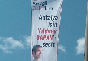 Sapan, ‘Sevgili CHP’liler… Antalya için Yıldıray Sapan’ı seçin’ yazılı iki dev bez afiş hazırlatıp dün gece Antalya’nın en işlek caddelerinden 100’ncü Yıl’a astırdı. Afişlerin asılmasının üzerinden 12 saat geçmeden, birileri iplerini kesti.