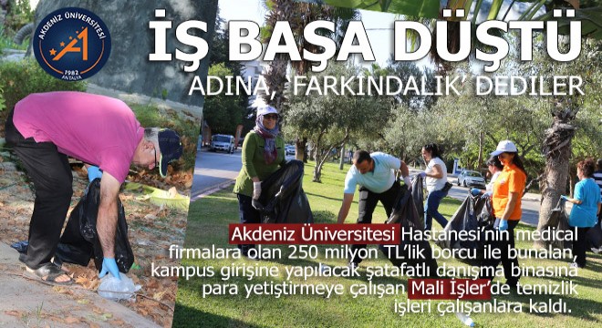 Akdeniz Üniversitesi Hastanesi'nin medikal firmalara olan 250 milyon TL borcu ile bunalan, ekonomik kriz nedeniyle kamu kurumları tasarrufa yönelirken kampus alanına girişe şatafatlı danışma binası için para yetiştirmeye çalışan Mali İşler çalışanları bu kez temizliği kendileri yaptı. Ve, buna da yöneticiler, 'Farkındalık oluşturma' dedi.