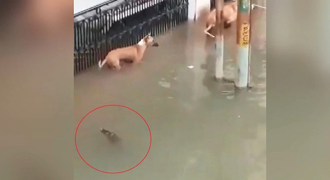Yoğun yağışların etkili olduğu Vadodara şehrinde meydana gelen sel sonucunda, suda yüzen bir timsahın sokağın ortasında bulunan köpeğe saldırdığı görüldü.