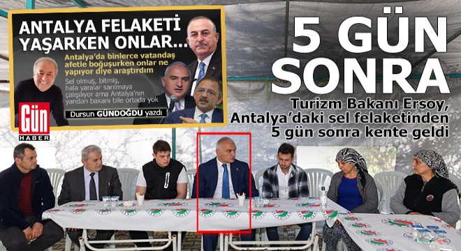 Babadan Antalyalı olan Bakan Ersoy, sel felaketinin yaşandığı gün Ankara’da gezici kütüphanenin Zonguldak’a uğurlanması törenine katılmış, ardından Antalya’ya gelmesi beklenirken o Didim ve sonra da Aydın’a gitmişti.