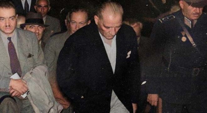 Haydarpaşa İstasyonu'nda elleri cebinde yürüdüğü bir anı ölümsüzleştiren fotoğrafta Atatürk, yanında dönemin önemli isimleriyle birlikte, Ankara'ya gitmek üzere trene yürürken yolda objektiflere yansıdı.