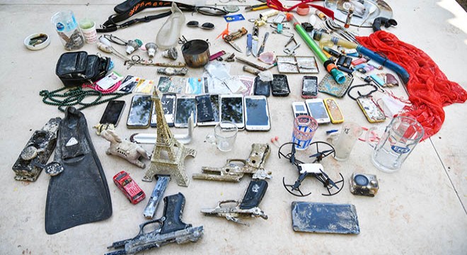 Suyun altında karada kullanılan hemen hemen her şeyle karşılaştıklarını söyleyen Prof. Dr. Mehmet Gökoğlu, "Araba aynasından lastiğe, aküye kadar her şeyi gördük. İnşaat demirleri, bank, sanki karadaki her şeyi suya atmışlar gibi. Su altında gördüğümüz büyük malzemeleri getiremiyoruz. Çıkarabildiklerimizi suyu temizlemek adına karaya çıkarıyoruz. Ufak olanları ve enteresan gördüğümüz şeyleri alıyoruz. Bu ürünler suyu kirletip, canlı yaşamını tehdit ediyor" dedi. Genelde cep telefonu, elektronik aletler, kilitler bulduklarını ifade eden Prof. Dr. Gökoğlu, "Ancak en ilginci takma diş oldu. Bunları bir sergide, sergilemeyi düşündüğümüz için topluyoruz. Bunların arasında şarj aleti, silah, dron, cep telefonu gibi şeyler var. Topluluk odamızın önüne bir yazı yazdık. Zaman zaman öğrencilerimizin kullanabileceği eşyaları bırakıyoruz" diye konuştu.