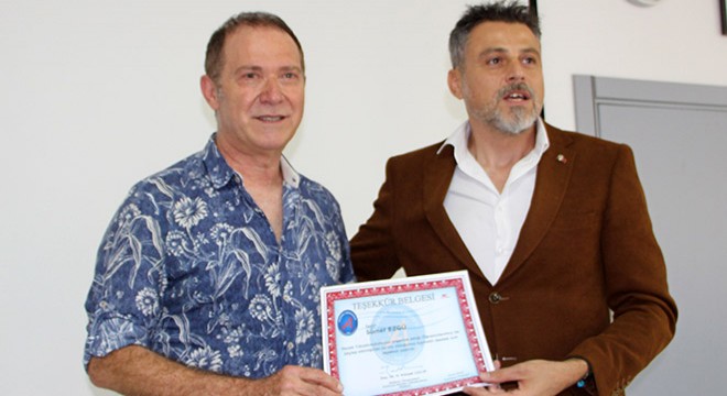 Söyleşinin sonunda Kumluca MYO Müdürü Doç. Dr. Kürşat Çelik tarafından Sümer Ezgü'ye günün anısına teşekkür belgesi verildi.