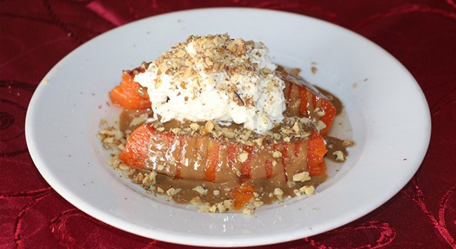 "Soyulduktan sonra şeker ile bekleterek, tencerede suyunu salıyor. Ertesi gün kaynatma aşaması oluyor. Taş fırında üstünün kızarmasını sağlıyoruz ve sunuma hazırlıyoruz. çifte kavrulmuş tahin, ceviz tercihe göre de kaymakla servis ediyoruz"