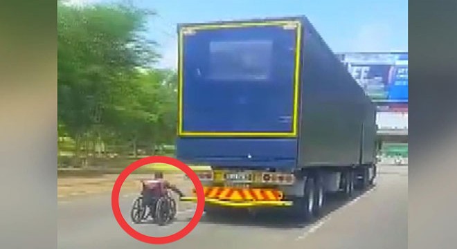 Güney Afrika’nın başkenti Pretoria’da tekerlekli sandalyeli bir adamın, saatte yaklaşık 80 km hızla giden bir TIR'ın arka tamponuna tutunarak ilerlediğini görenler gözlerine inanamadı. Tekerlekli sandalyedeki adam, hem kendisini hem de trafikteki diğer sürücüleri tehlikeye attığını umursamadan ilerlerken, arkadan gelen sürücüler o anları kaydetti.