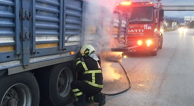 Olay, dün saat 18.30 sıralarında Alparslan Türkeş Bulvarı'nda meydana geldi. Burdur'dan Antalya yönüne giden sürücüsünün kimliği öğrenilemeyen 32 ACU 631 plakalı tırın arka lastiklerinden duman ve alev çıkmaya başladı. Durumu fark eden çevredekilerin uyarısı üzerine sürücü tırı durdurdu. İhbar üzerine olay yerine itfaiye ekipleri sevk edildi. Arka balataların aşırı ısınması nedeniyle başlayıp, lastiklere de sıçrayan yangın Bucak Belediyesi itfaiye ekiplerinin müdahalesiyle büyümeden söndürüldü. Olay nedeniyle Burdur'dan Antalya yönüne trafik kısa süreliğine kapandı.