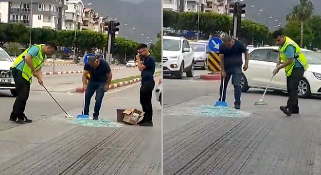 Diğer araçların zarar görmemesi ve trafik akışını sağlamak için cadde üzerindeki bir esnaf süpürge ve kürek getirdi. Trafik polisi süpürürken, esnaf da kürekle cam kırıklarını toplayıp, bir kutuya koyduktan sonra çöpe attı ve trafik akışı kısa zamanda sağlandı.