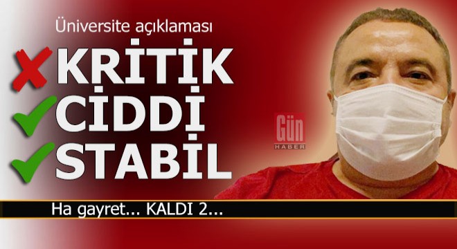 Akdeniz Üniversitesi Hastanesi Başhekimliği'nden Başkan Böcek'in sağlık durumu hakkında yapılan açıklamada, "Antalya Büyükşehir Belediye Başkanımız Sn. Muhittin Böcek'in yoğun bakımdaki takip ve tedavisi devam etmektedir. Durumu ciddiyetini korumakla birlikte bulguları stabildir" denildi.
