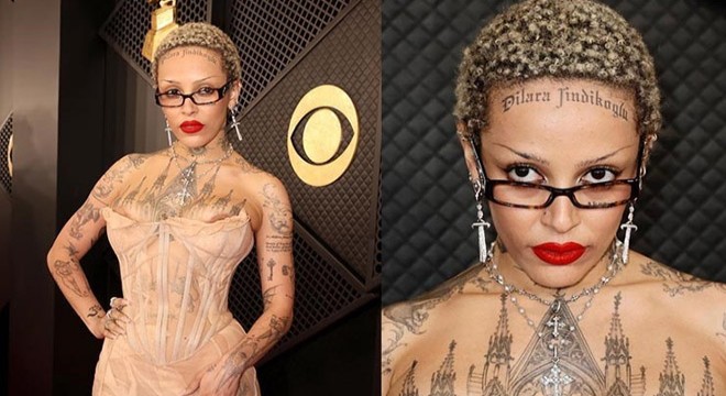 Üstüne üstlük, Doja Cat elbisenin sahibi tasarımcı Dilara Fındıkoğlu'nın ismini alnına yazdırınca ilgi odağı oldu.
