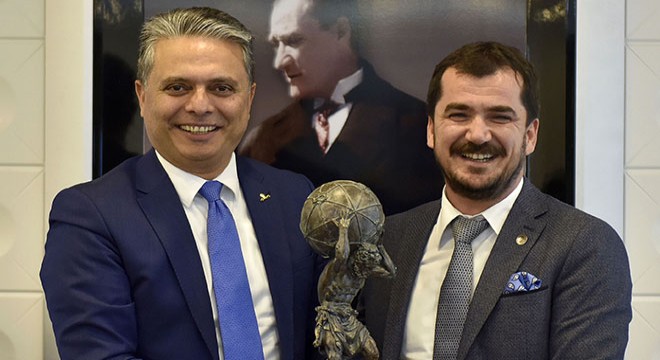 Ziyarette Göksan, günün anısına Başkan Uysal'a Yunan mitolojisinde yer alan Atlas'ın biblo çalışmasını hediye etti.