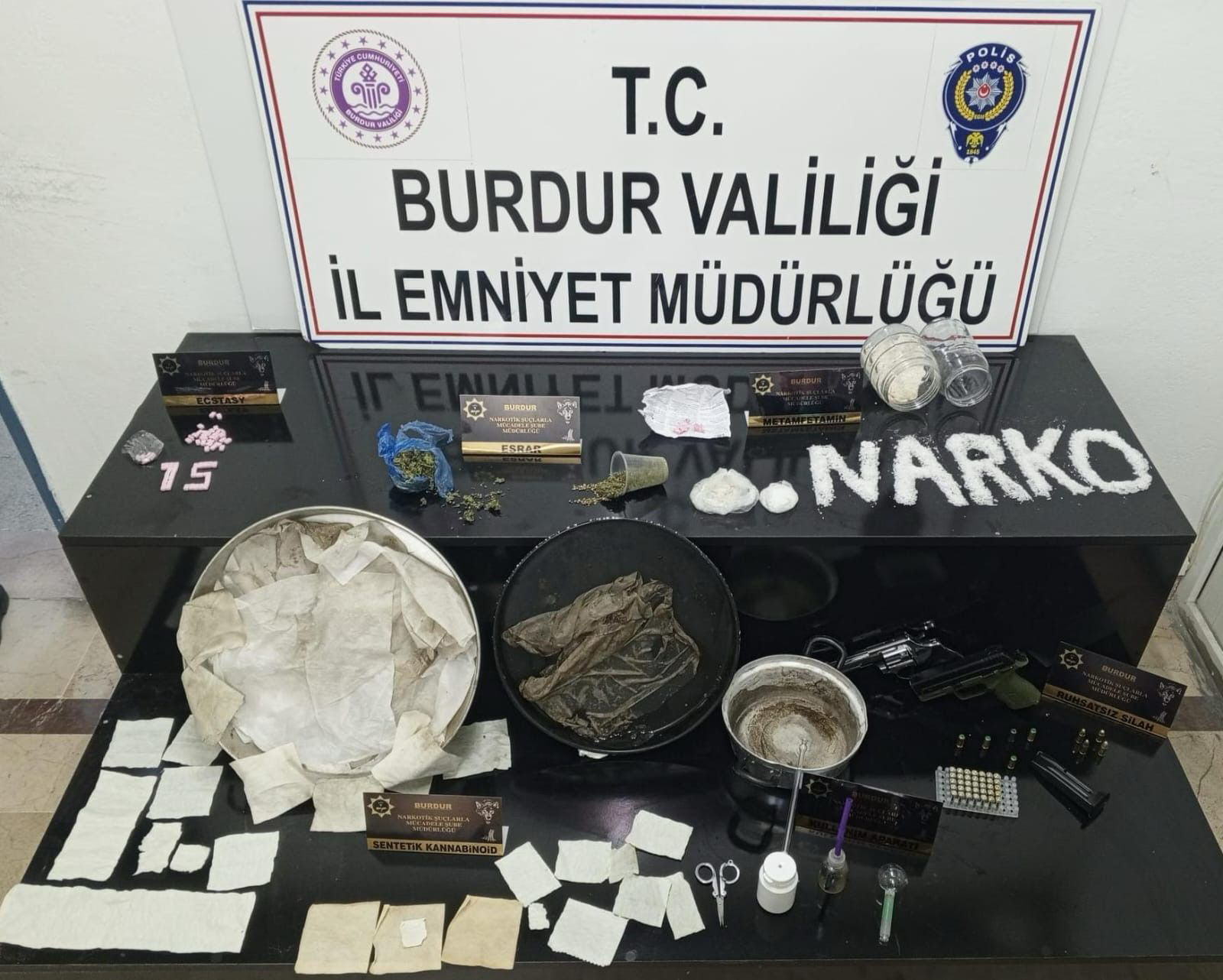 Şüphelilerin ikamet, araç ve üzerlerinde yapılan aramalarda yaklaşık 26 bin kullanımlık sentetik kannabinoid enjekte edildiği değerlendirilen kağıt parçası, 640 gram metamfetamin maddesi, 46 sentetik ecza, 5 hassas terazi, 40 gram skunk, 66 ecstasy hap, uyuşturucu madde ölçüm ve kullanımına yarayan çok sayıda aparat ile 13 tabanca ve 103 fişek ele geçirildi.