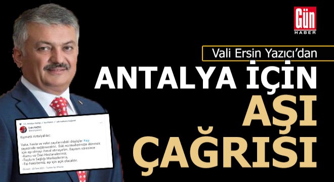 Vali Yazıcı, yaptığı paylaşımda, “Kıymetli Antalyalılar önceden olduğu gibi sağlıkla Kapalıyol'da gezmek, Konyaaltı'nda denize girmek, Kent ormanında piknik yapmak, eski Lara yolunda yürüyüş yapmak, tiyatro ve sinema keyfi için lütfen aşı olalım" diye seslendi.