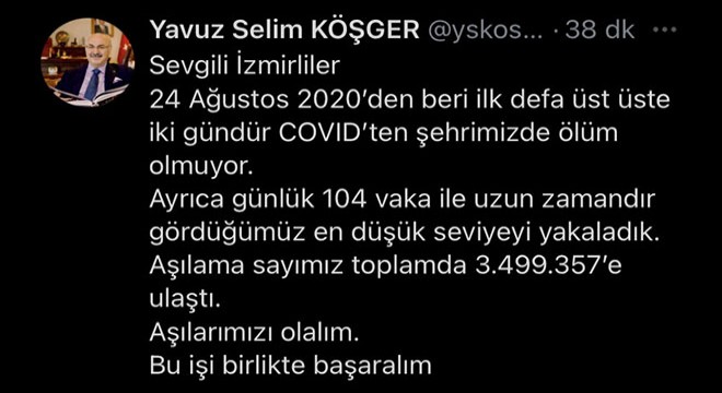 "Sevgili İzmirliler, 24 Ağustos 2020'den beri ilk defa üst üste iki gündür COVID'ten şehrimizde ölüm olmuyor. Ayrıca, günlük 104 vaka ile uzun zamandır gördüğümüz en düşük seviyeyi yakaladık. Aşılama sayımız toplamda 3.499.357'e ulaştı. Aşılarımızı olalım. Bu işi birlikte başaralım."