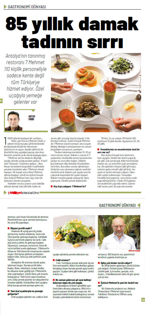 Akdağ: Dedemin ilk açtığı yere hiç kadın gitmezmiş herkes erkekmiş. Sonra ilk tek tük bayanlar gelmeye başlamış. Sahildeki üçüncü yerimizde plajımız da vardı. Tabi plaj olunca aileler de gelmeye başlıyor. Siyasetçisi, sanatçısı, turizmcisi, hatta ilk turist kafilesi orada ağırlanıyor. 7 Mehmet’in dünya ve Türk basını ile tanışması bu sayede oluyor. Bizi ileriye götüren ve büyüten babam oldu. Sonra şu anki yerimizi açtık 1997’de. Antalya’nın ilk restoran olarak açılan işletmesi oluyor. Burada profil daha başka. Basın, televizyon, sosyal medya bu döneme denk geldiği için 7 Mehmet’in altın çağı başlıyor. Çünkü daha çok insanla buluşuyoruz. Yerli turist sayısı inanılmaz arttı. Gelip yemek yiyenler ve takipçilerimiz İstanbul ağırlıklı. İstanbul’dan adam özel uçağına biniyor buraya yemek yemeye geliyor.