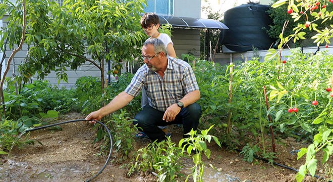Yağmur suyunun kaliteli olduğunu aktaran Akın, "Çatılarda biriken kuşların gübreleri, çiçeklerin ve çevrenin tozları yağmur suyuyla beraber aşağıdaki havuza ve buradaki tanklara birikiyor. Saf ve değişik minerallerin olduğu yağmur suyu ile bahçemize diktiğimiz meyve ağaçlarını ve sebzelerimizi suluyoruz. Yaklaşık 5 yıldır bu işlemi devam ettiriyorum" diye konuştu.