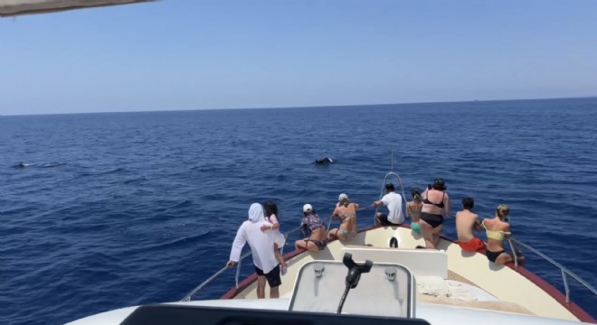 Alanya Kalesi açıklarında tekneyle gezintiye çıkan turistler yunuslarla karşılaştı. Aniden ortaya çıkan 6 yunus tekneyle yarışıp, çeşitli hareketler yaparken, tatilciler de bu anları ilgiyle izledi. Eğlenceli görüntülerin ortaya çıktığı yolculukta yunusları izleyen turistler o anları cep telefonları ile kaydetti.