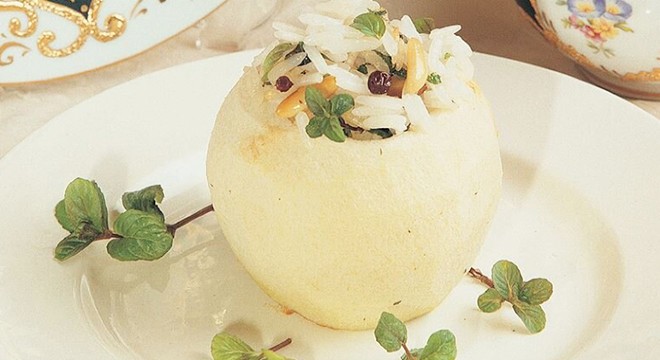 Toz şeker, tuz ve limon suyunu ilave edip karıştırın. Tencereyi ateşten alıp soğumaya bırakın. Elmaları yıkayıp kabuklarını soyun. Sebze oyacağı ile çekirdekli kısımlarını çıkarın ve içlerini biraz oyun. Hazırladığınız iç pilavı elmalara doldurun.